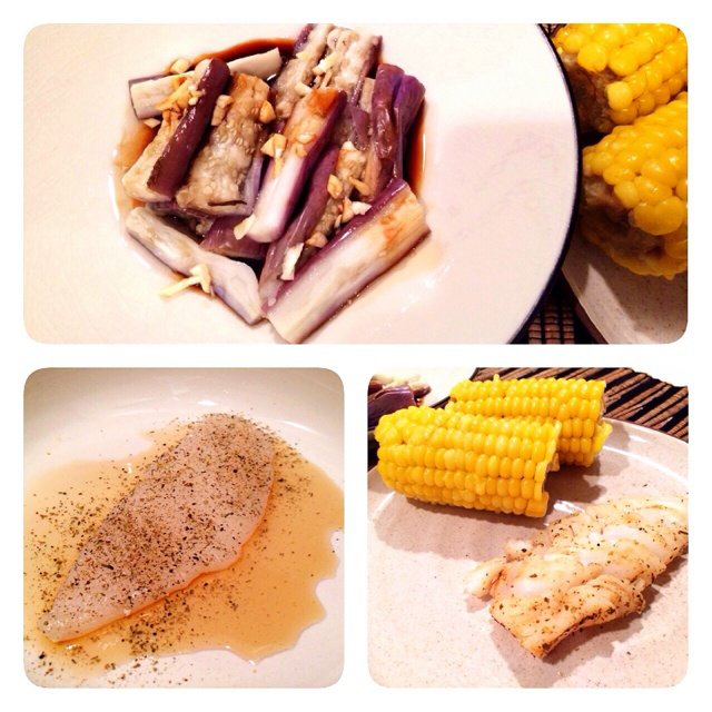 拌茄子,蒸玉米,煎鳕鱼