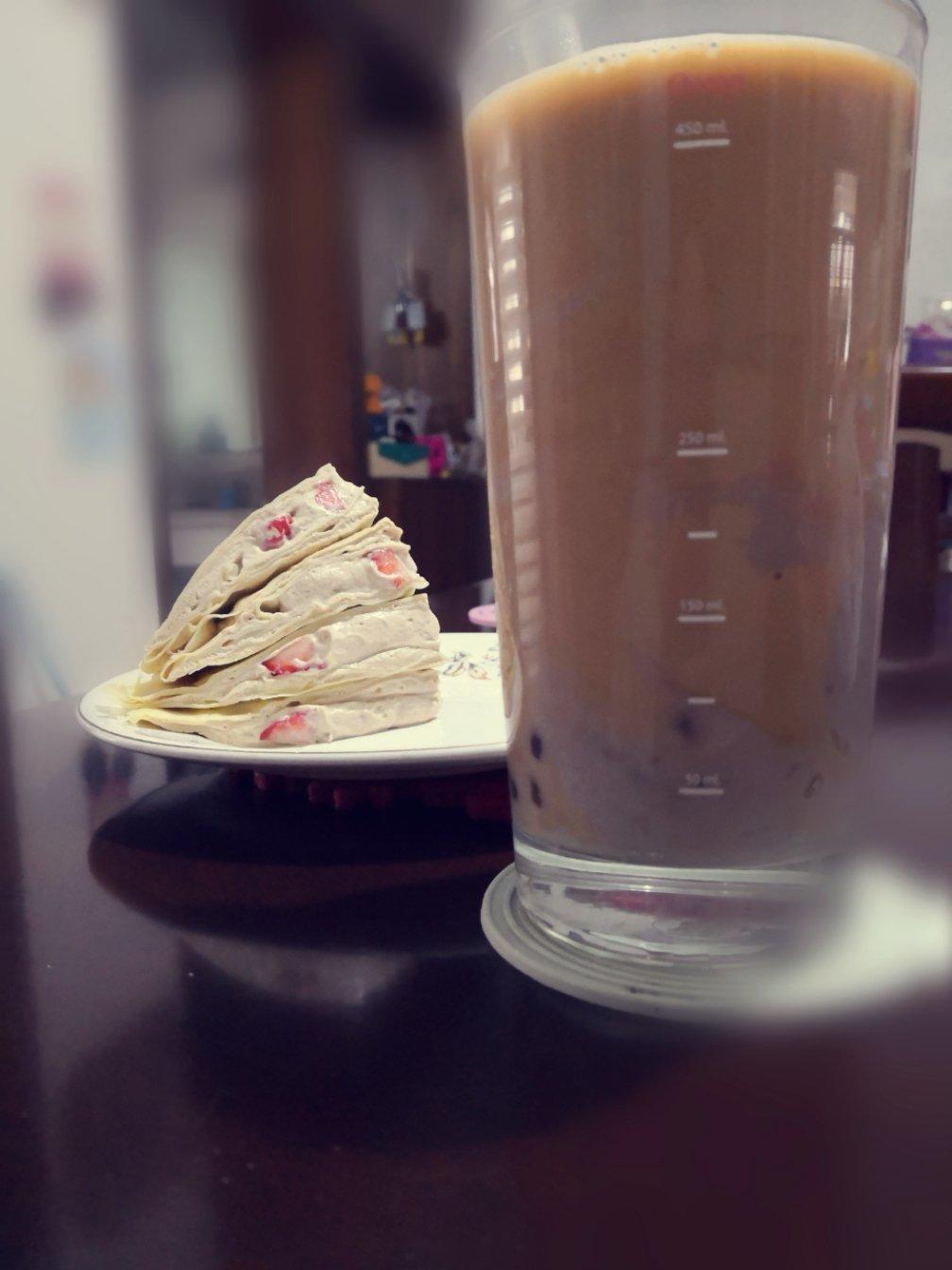 做泡芙剩下的奶茶卡仕达做了草莓千层,加上芋泥珍珠奶茶,甜蜜蜜的早餐