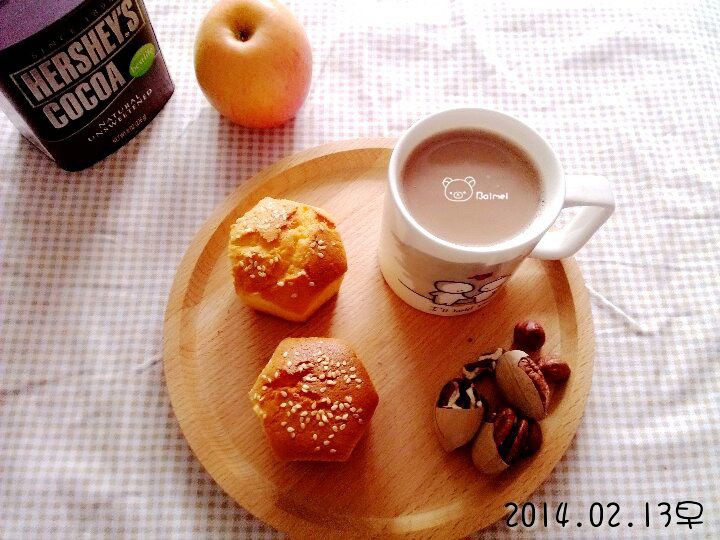 早安,周四,美好的一天从早餐开始……豆浆热可可,蜂蜜蛋糕,苹果,长寿果榛子几枚#早安!厨房...