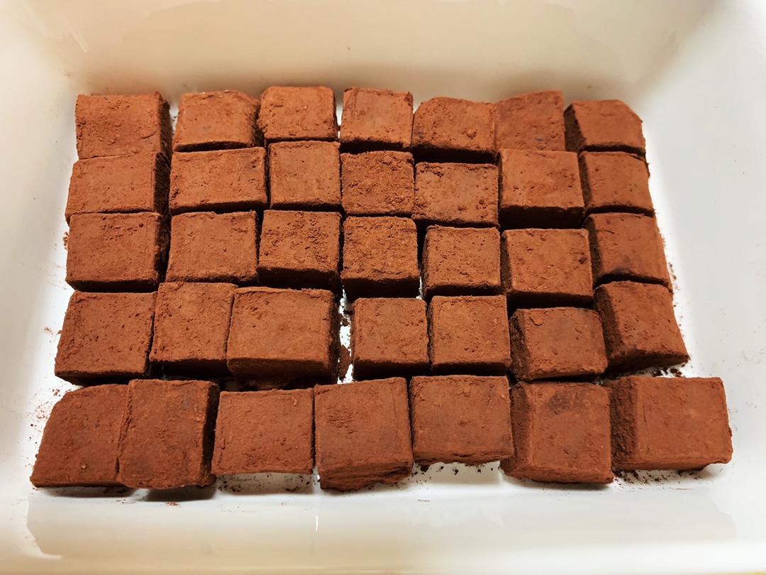 用了143克德芙的黑巧克力,100克淡奶油,3克白砂糖,没加黄油,做出来很好吃!就是切的过程和裹可可粉比较麻烦