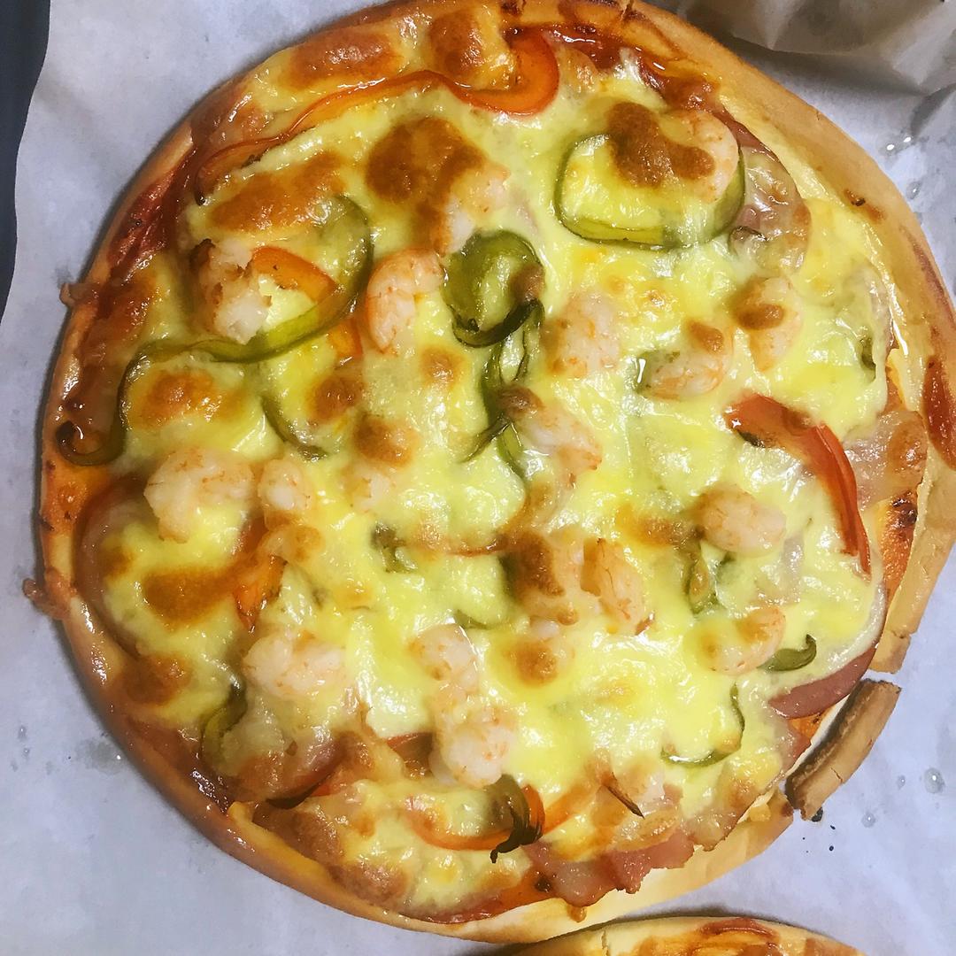 海鲜至尊pizza,没放mozarella,用parmesan替代做了个绿色版——果然mozarella才是pizza绝...