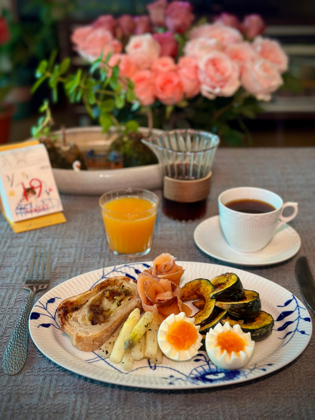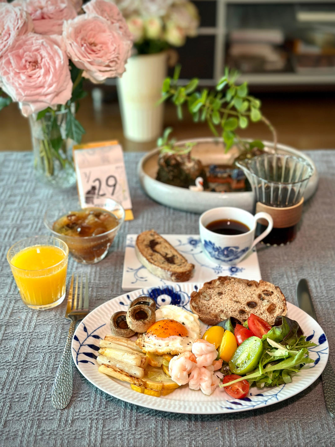 每日Vc鲜榨橙柚汁,白芦笋当季且吃且珍惜,蘑菇碗里一口汤鲜呀🤗盲摸的面包忘记谁家的了。来块史多伦配咖啡,...