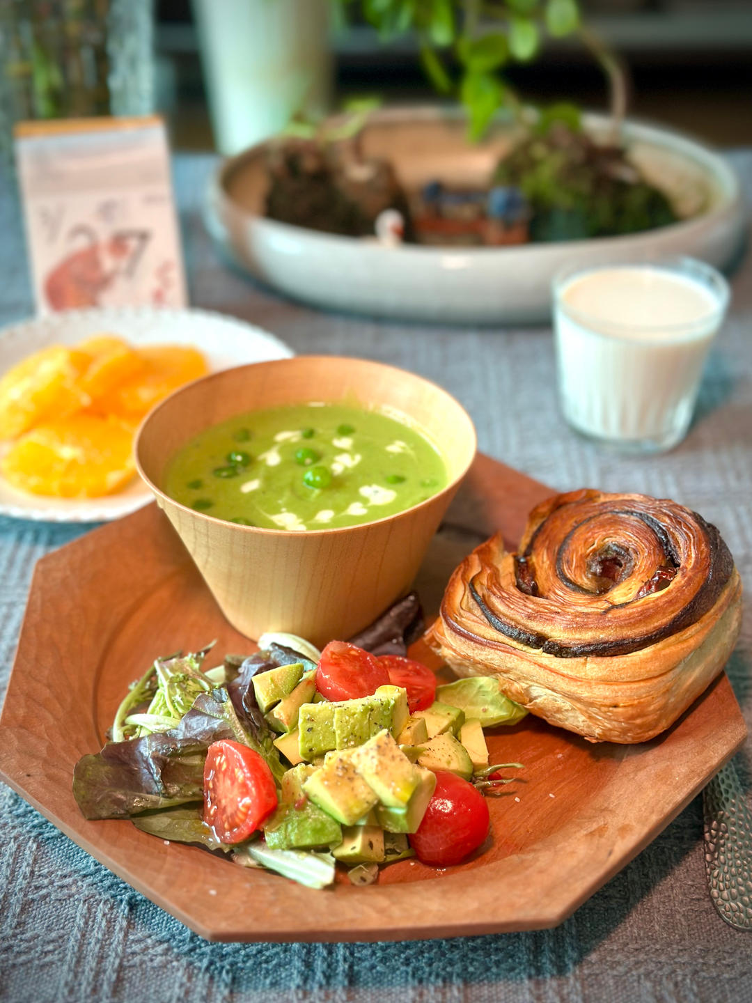 豌豆浓汤配上青酱番茄面包,把春天装在餐盘里。