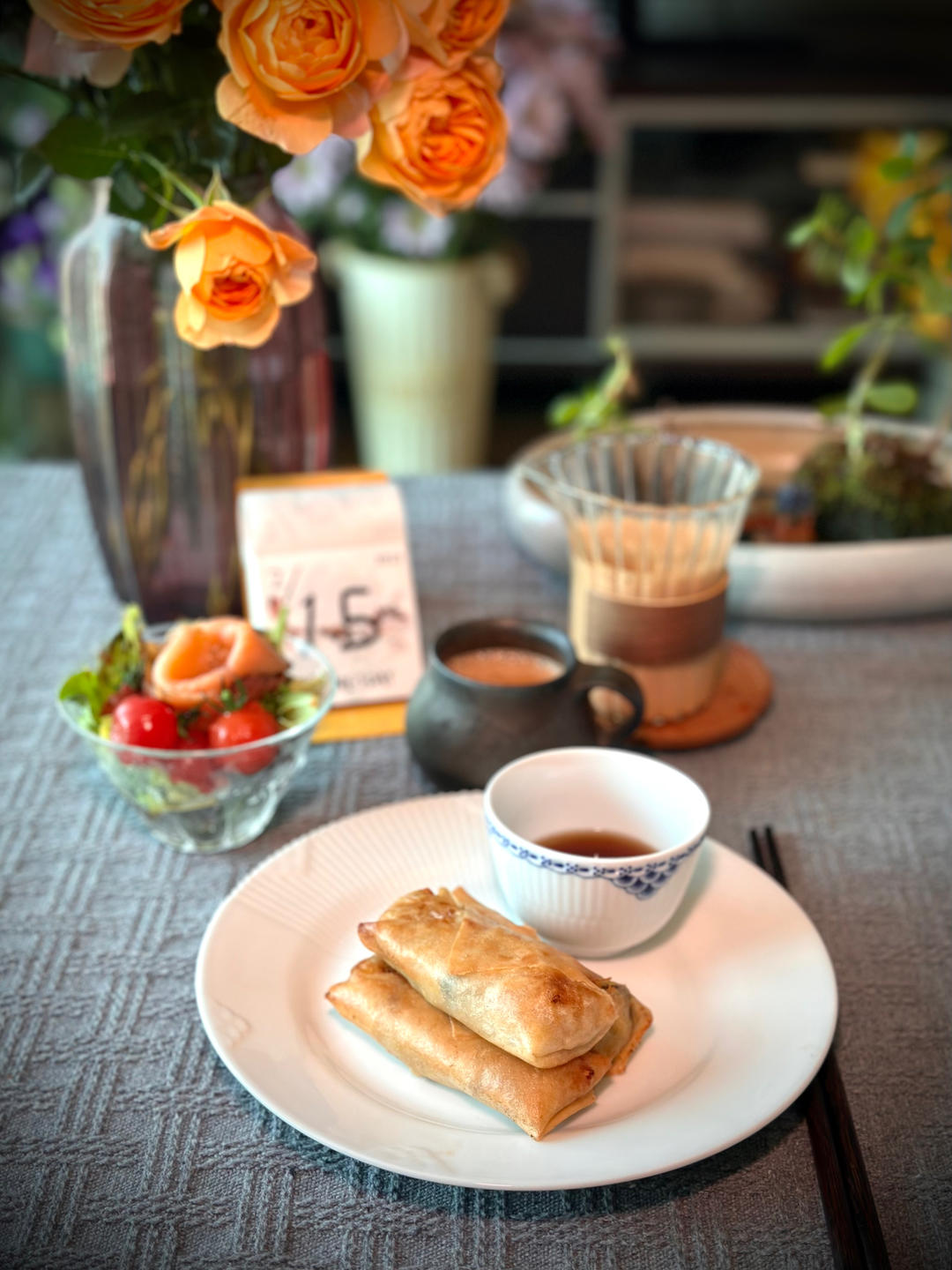 🈶️阳光的早晨真好!奶茶、沙拉、春卷,中西合璧!