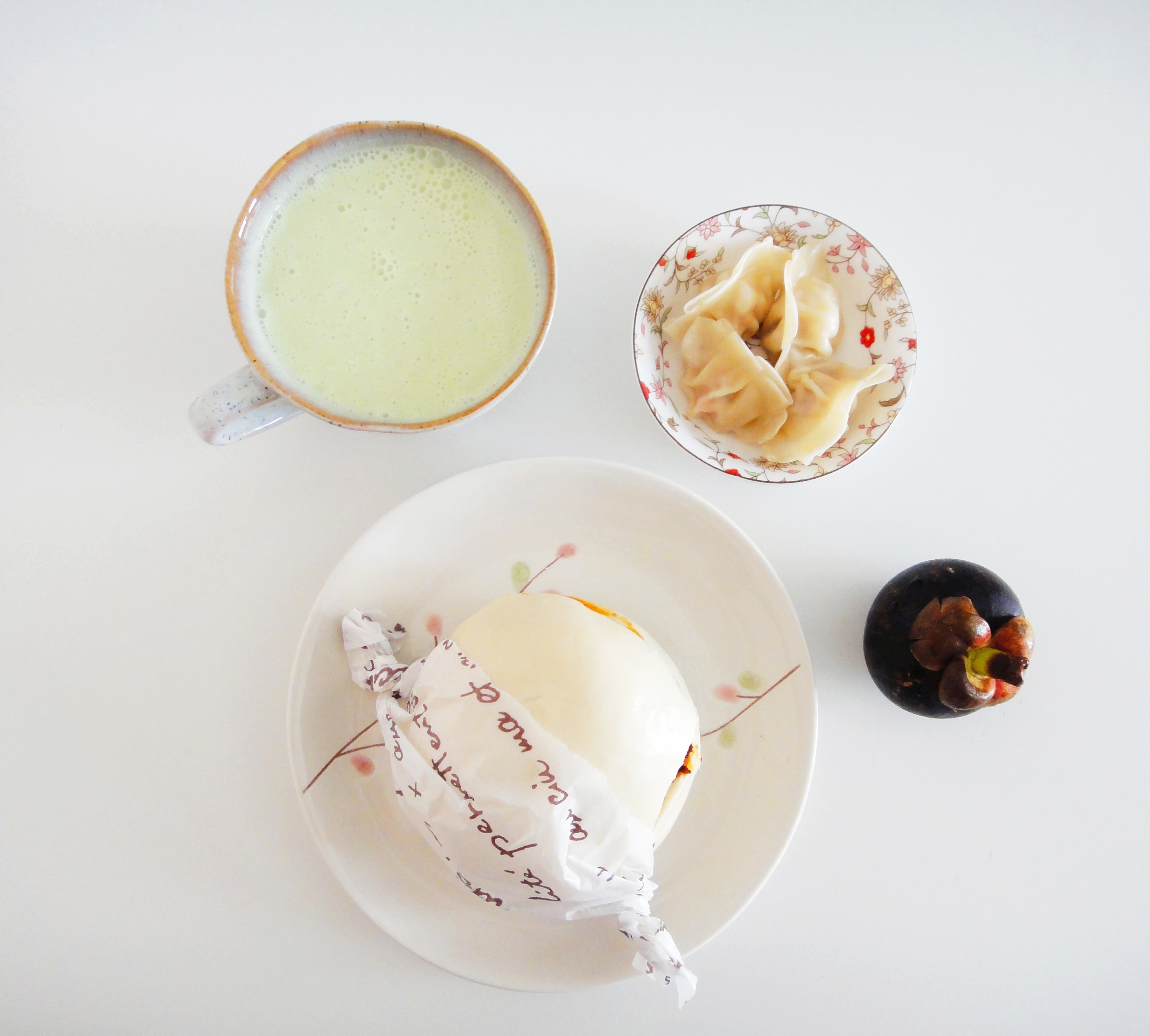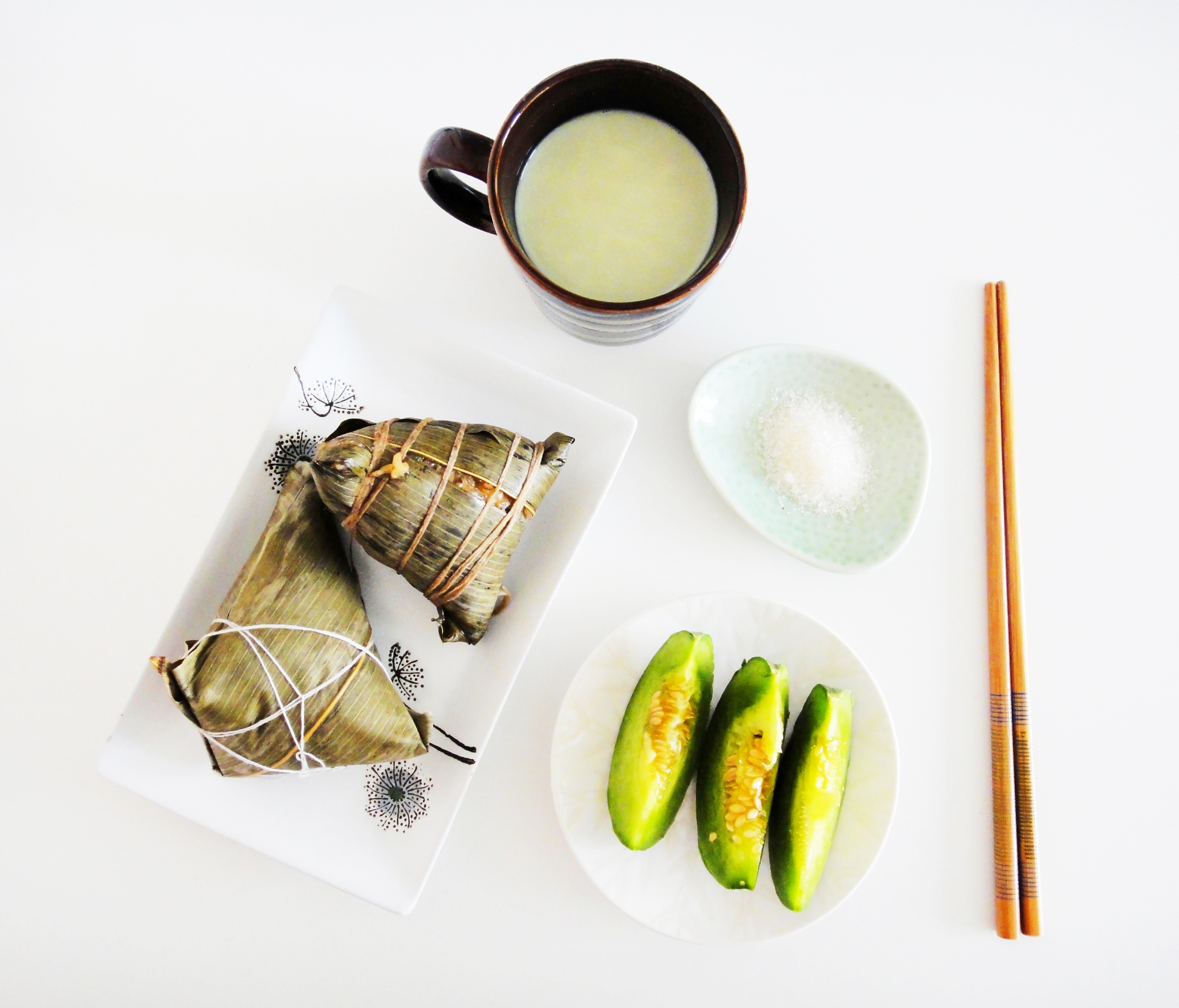 肉粽【咸】&豌豆白粽蘸糖【甜】+抹茶拿铁+香瓜