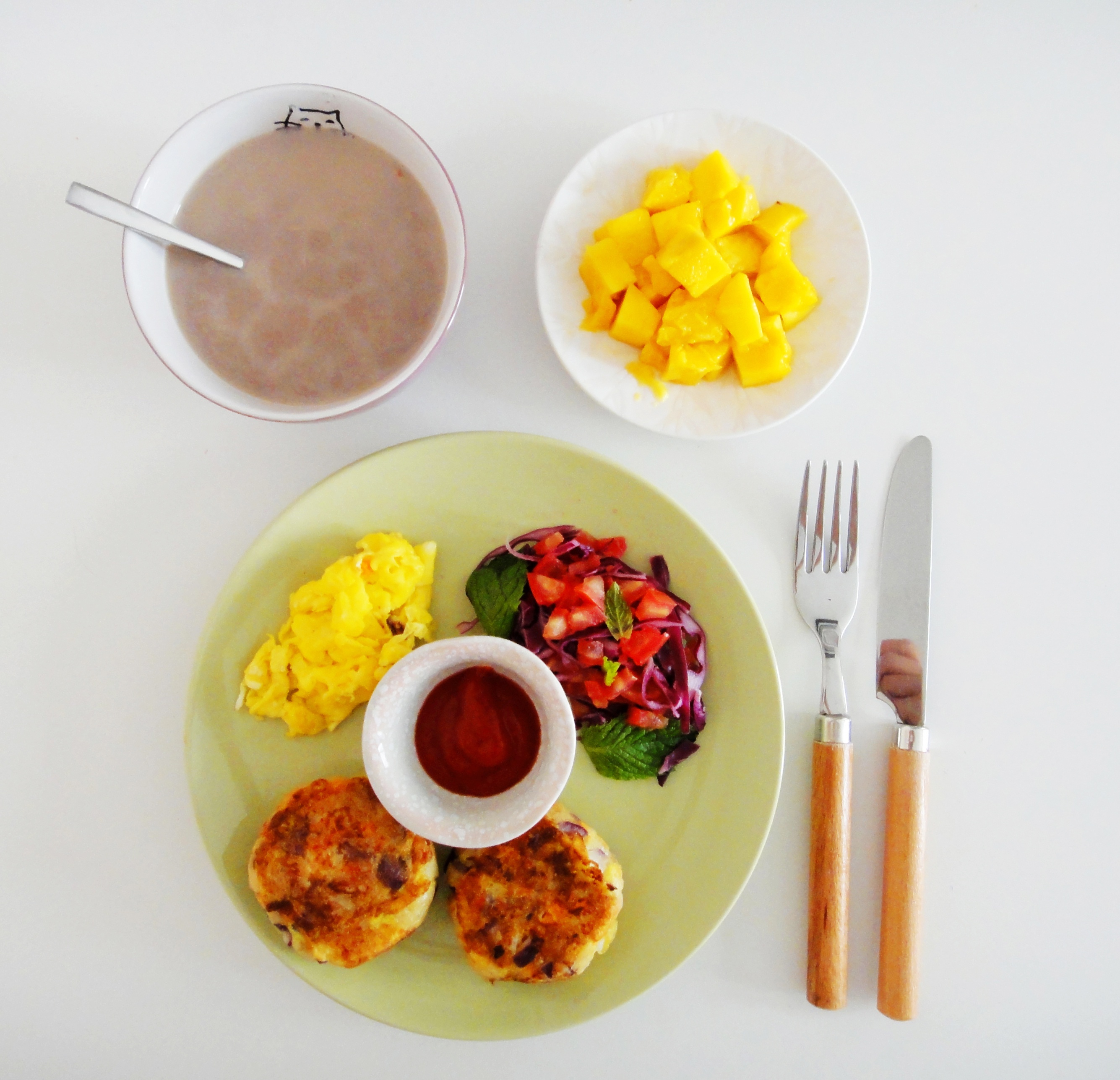吞拿鱼饼+色拉+炒嫩蛋+可可燕麦