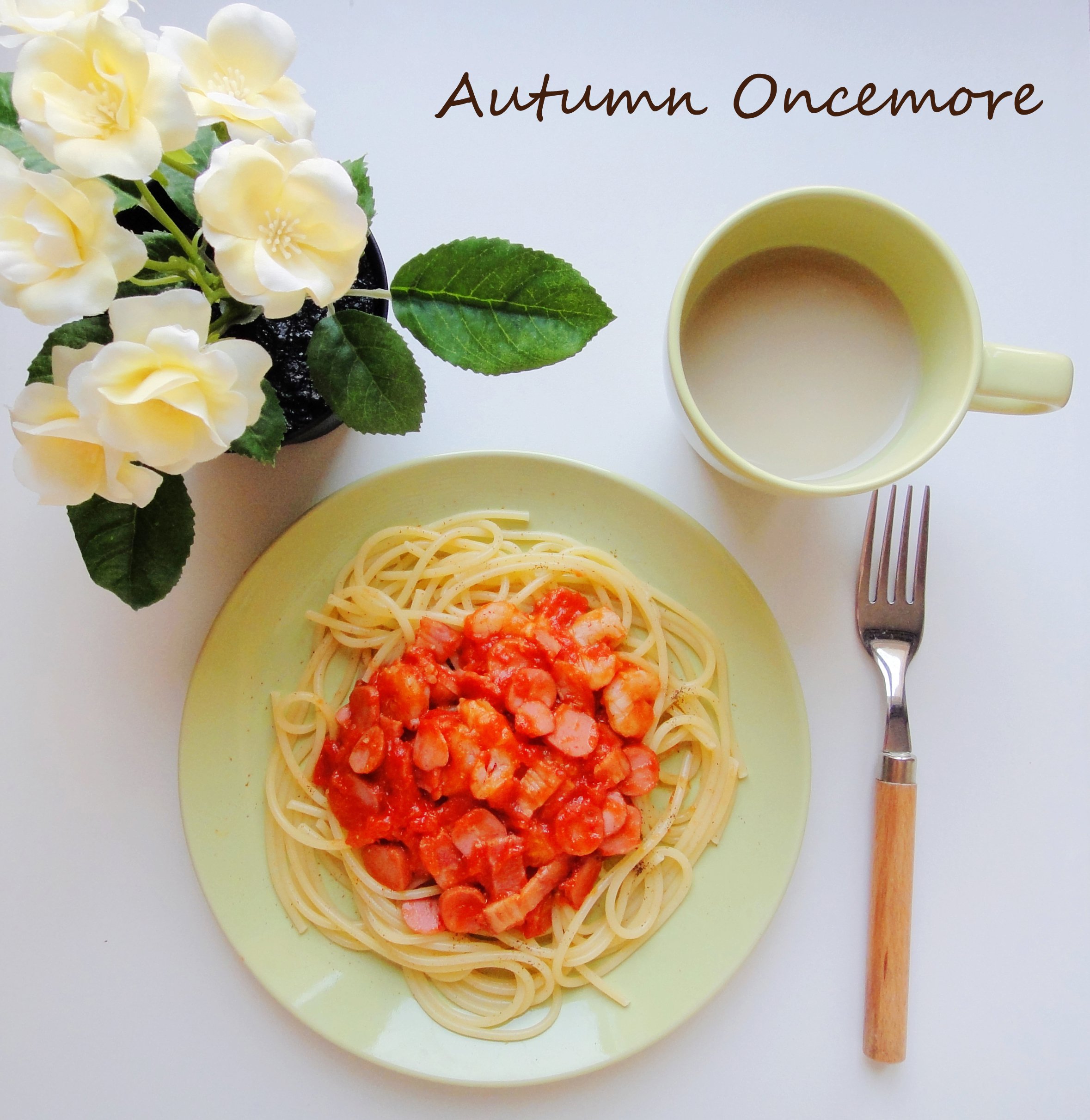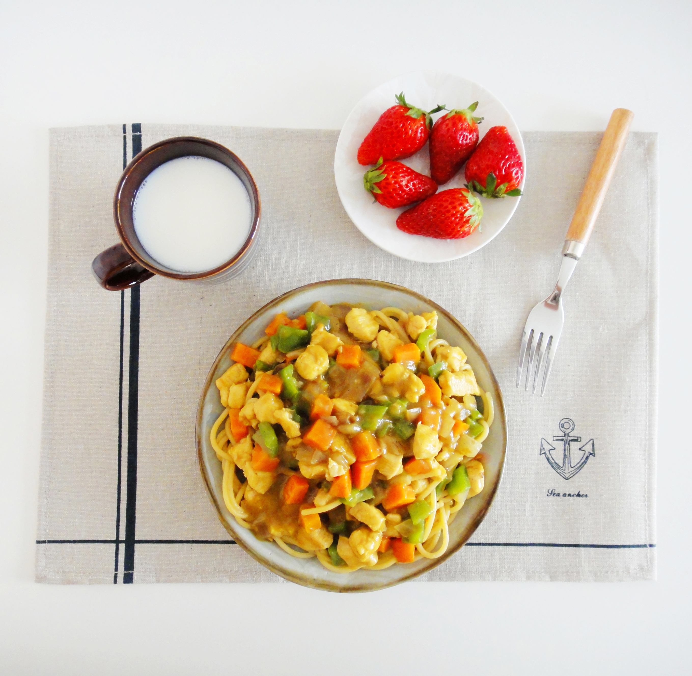 咖喱鸡肉意面+牛奶+草莓