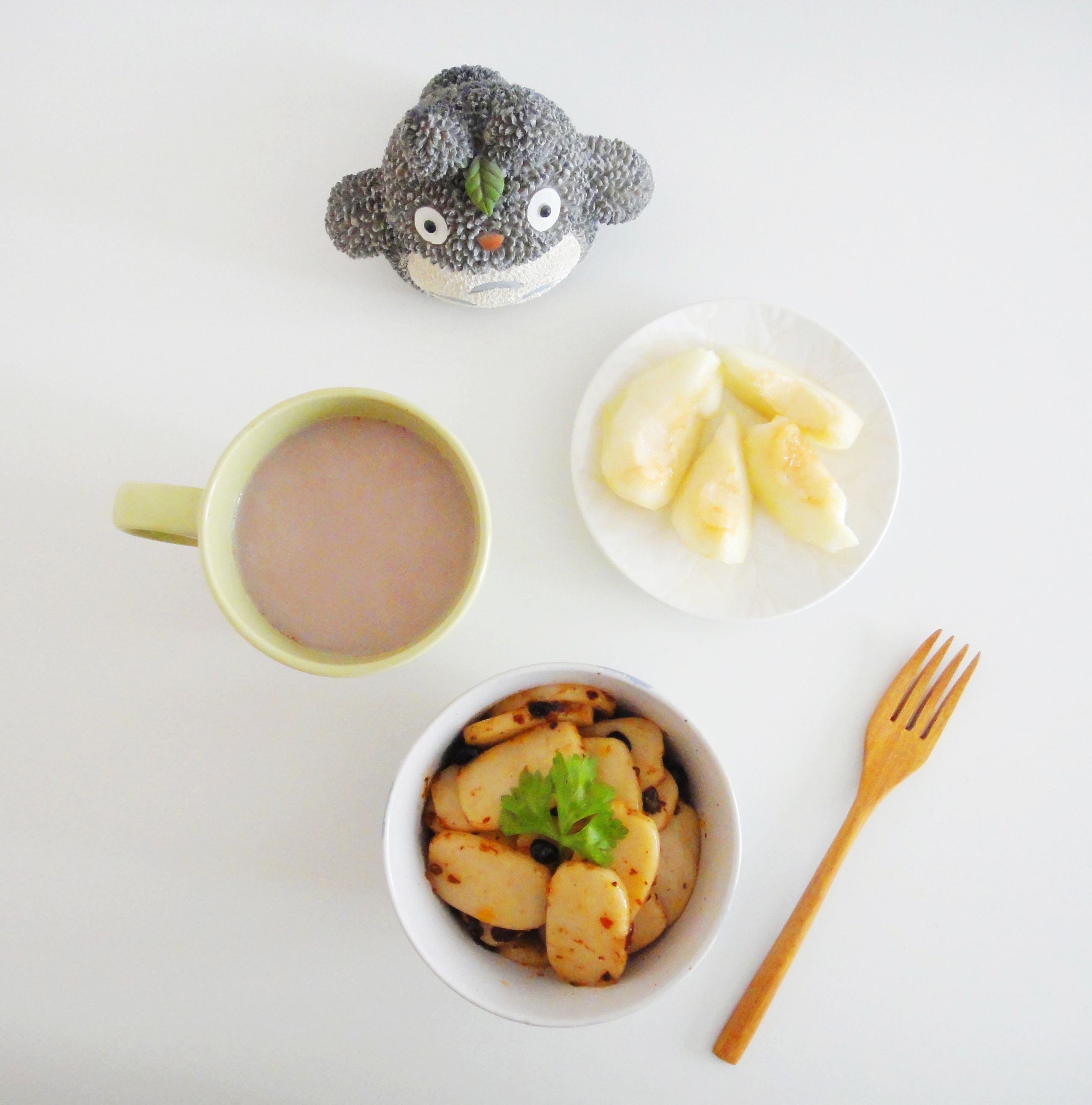 豆豉炒年糕+可可牛奶+水梨