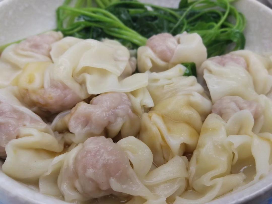 云吞伴青菜,鸡汤,提子