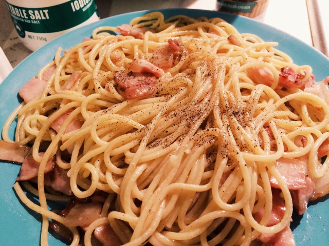 晚上简单烧烧 第一次做奶油培根面 蒜一定要爆~这样就很香 煮意面的时候一定要水里放盐 面...