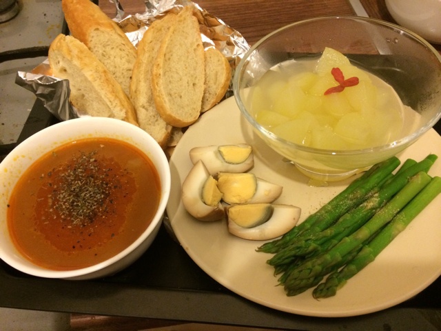 糖水青苹果、水煮芦笋、卤蛋、番茄牛尾汤、烤法棍