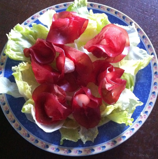 Bresaola包裹着樱桃马苏里拉芝士,在平底锅里加热使芝士融化后配着iceberg吃,太丰...