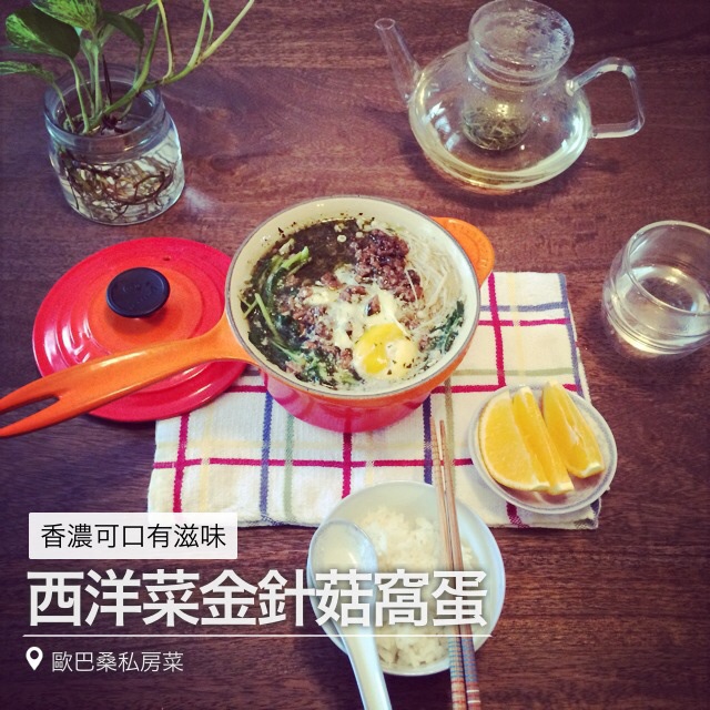 下课回家某程序员嚷嚷饿了。做了个快手菜。烫了金针菇西洋菜撒了现成的香椿素肉燥窝了个蛋。泡壶龙...