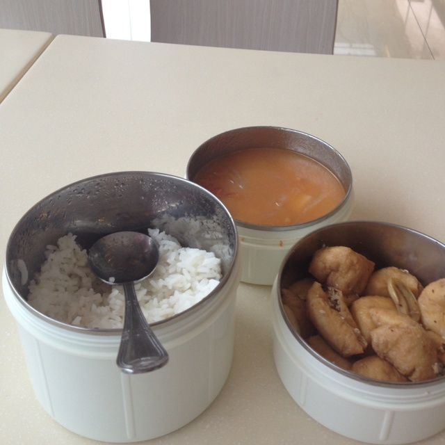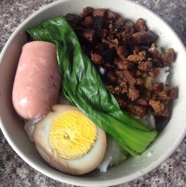 五花肉丁用卤过蛋剩下的卤汁,加上香菇丁,超赞的午餐!