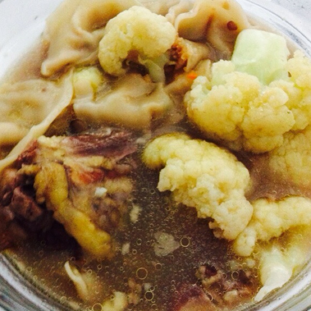 中午炖的鸡汤加点花椰菜,取个鸡翅膀,下个水饺,鲜到舌头掉