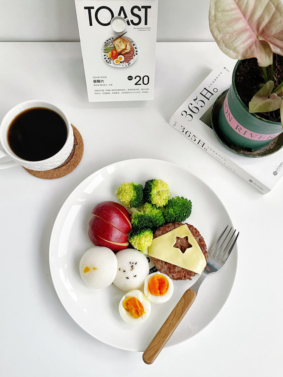 米糕 | 牛肉汉堡排 | 鸡蛋 | 西蓝花 | 苹果 | ☕