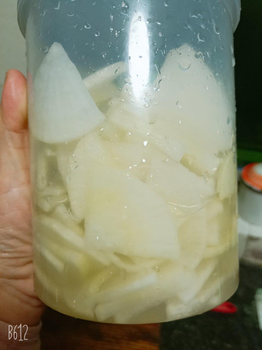 萝卜切片,用盐反复腌出水份,(两到三遍,盐腌后漂洗干净后再腌),把萝卜里的辣味腌出来。然后加盐,糖,白醋。味道偏甜,醋味...