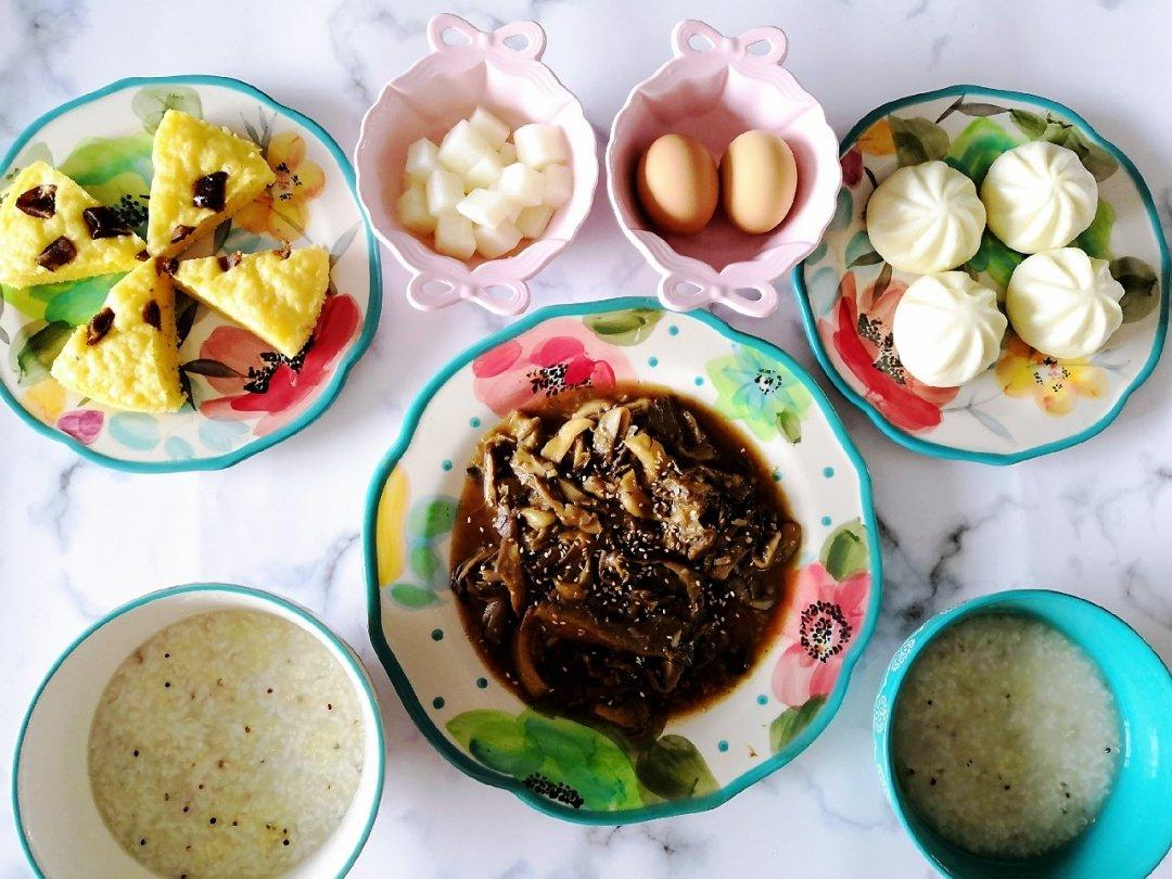 椒盐平菇+玉米发糕+藜麦粥+肉包+糖醋萝卜+水煮蛋