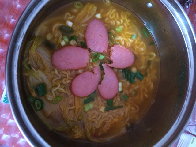 用的娃娃菜,最后撒了点葱花,放了点儿蒜肠,好吃~