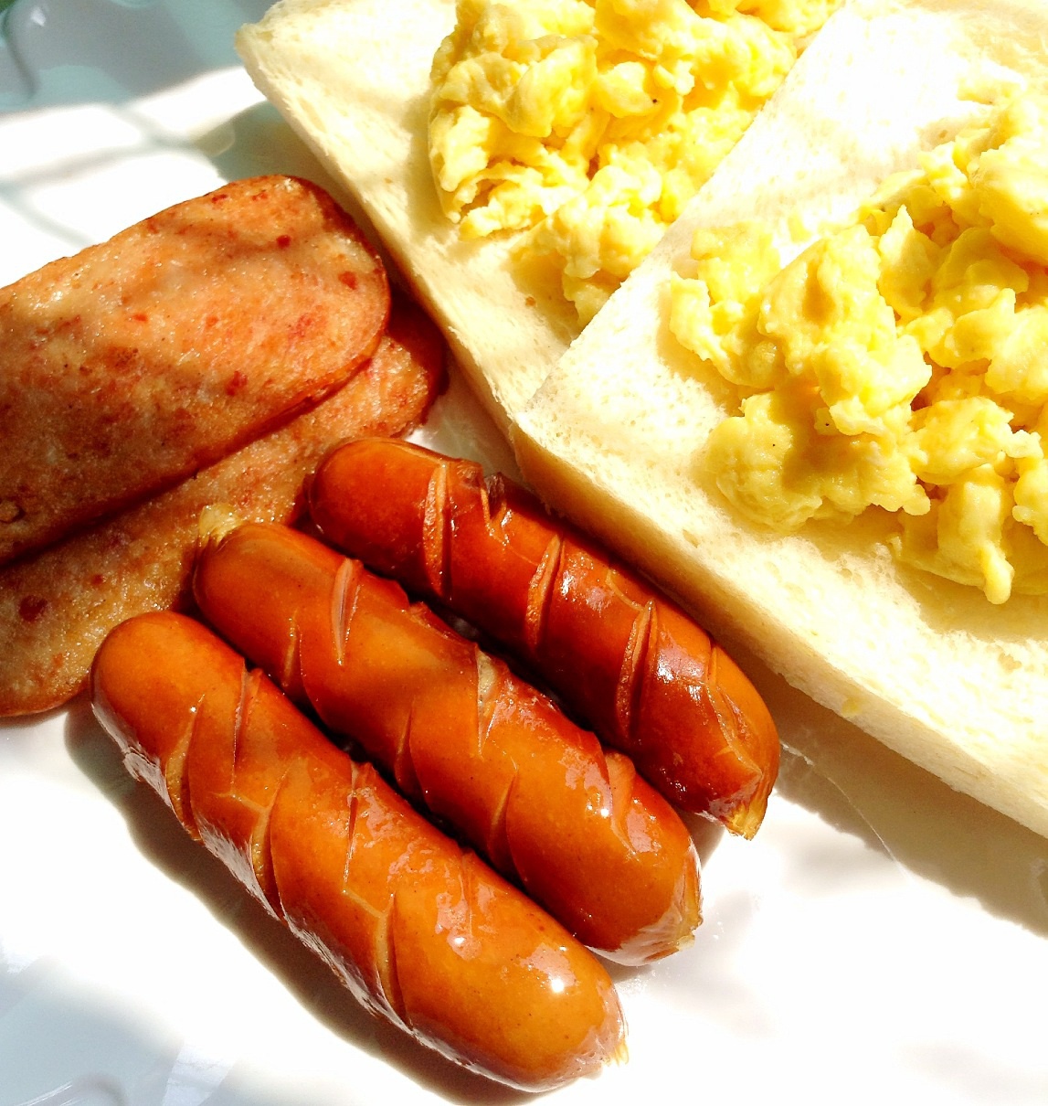 Brunch~~~餐肉肠仔配炒蛋多士,再加上一杯热奶茶;阳光灿烂的一天开始了