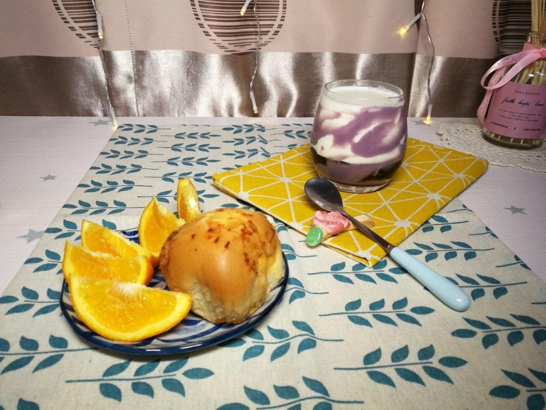 今日份:芋泥黑糖珍珠牛奶+橙子+肉松小面包