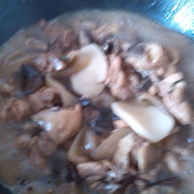 红烧鸡腿,放了香菇,川粉,年糕。没有炒好糖色,也没放很多酱油,颜色不够红润,口味还不错。