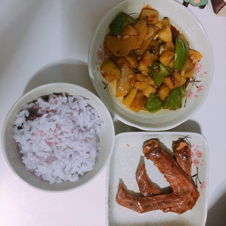 昨天晚饭,鸭翅在永辉超市买的,比绝味辣,而且除了辣没什么特别的,地三鲜放了勺蚝油,有点咸了