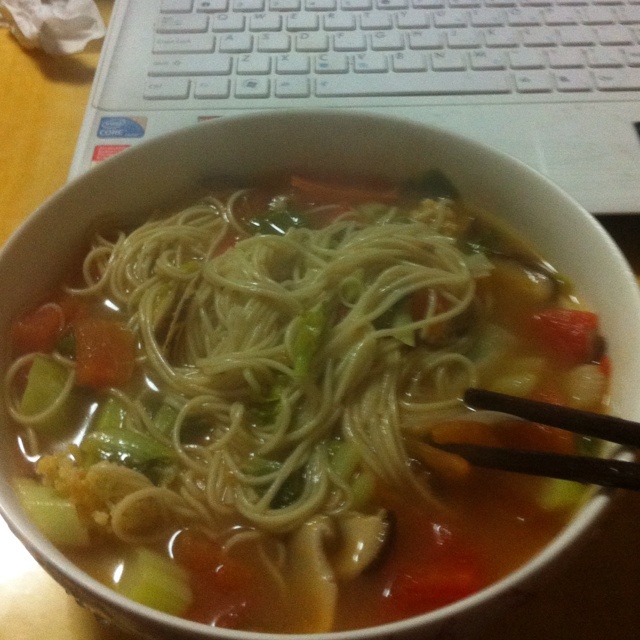 把昨天火锅剩料用鸡汤煮了下做成了麻辣烫。。哈哈。。把豆腐换成年糕就是正...