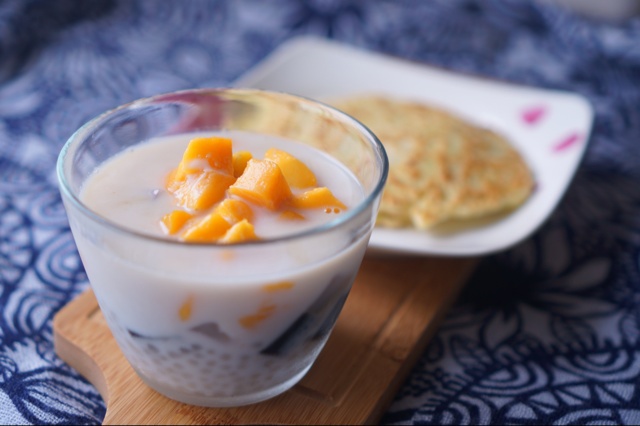 一份芒果西米,加了仙草和椰肉。摊了西葫芦面饼,不错的心情早餐。