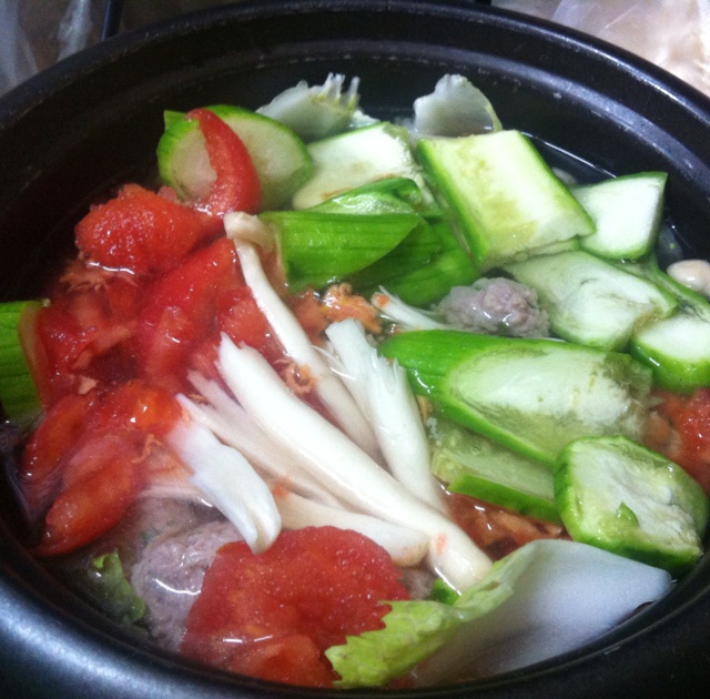 白菜丝瓜番茄海鲜菇作伴,鲜!