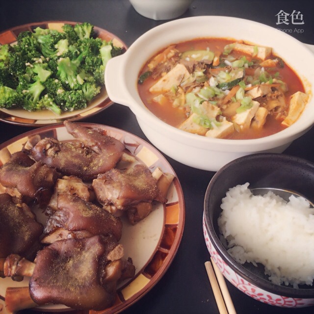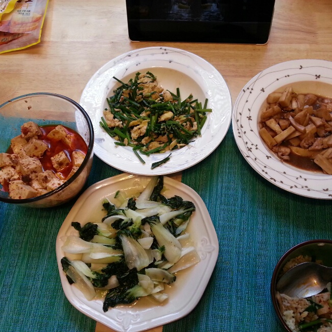 杏鲍菇炒鸡胸 清炒小白菜 麻婆豆腐 蒜豪鸡蛋 还有小火慢煮的白萝卜香菇汤~\(≧▽≦)/~