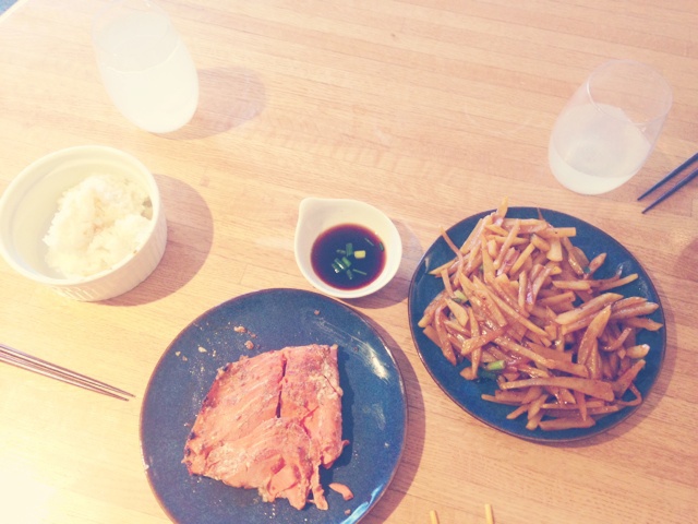 大酱煎三文鱼,炒土豆丝,柠檬水,粘米饭