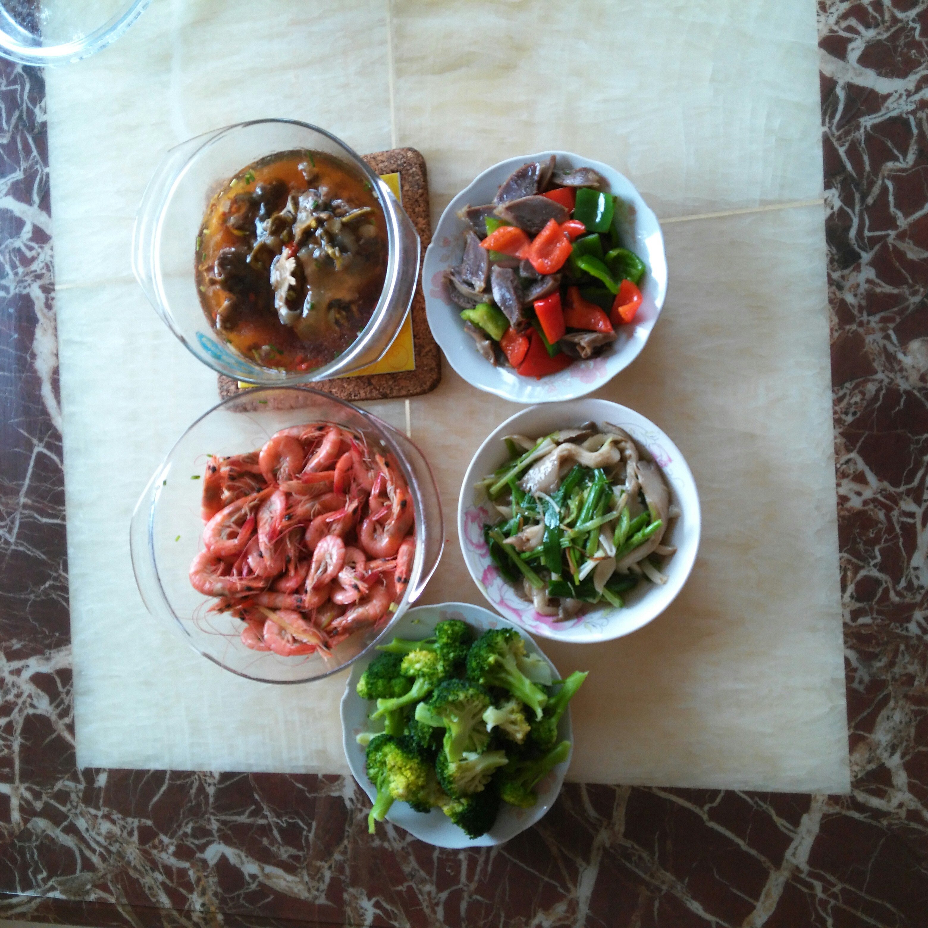 昨晚剩的甲鱼汤+白灼基围虾+蘸酱西兰花+大蒜炒苹菇+彩椒鸭珍