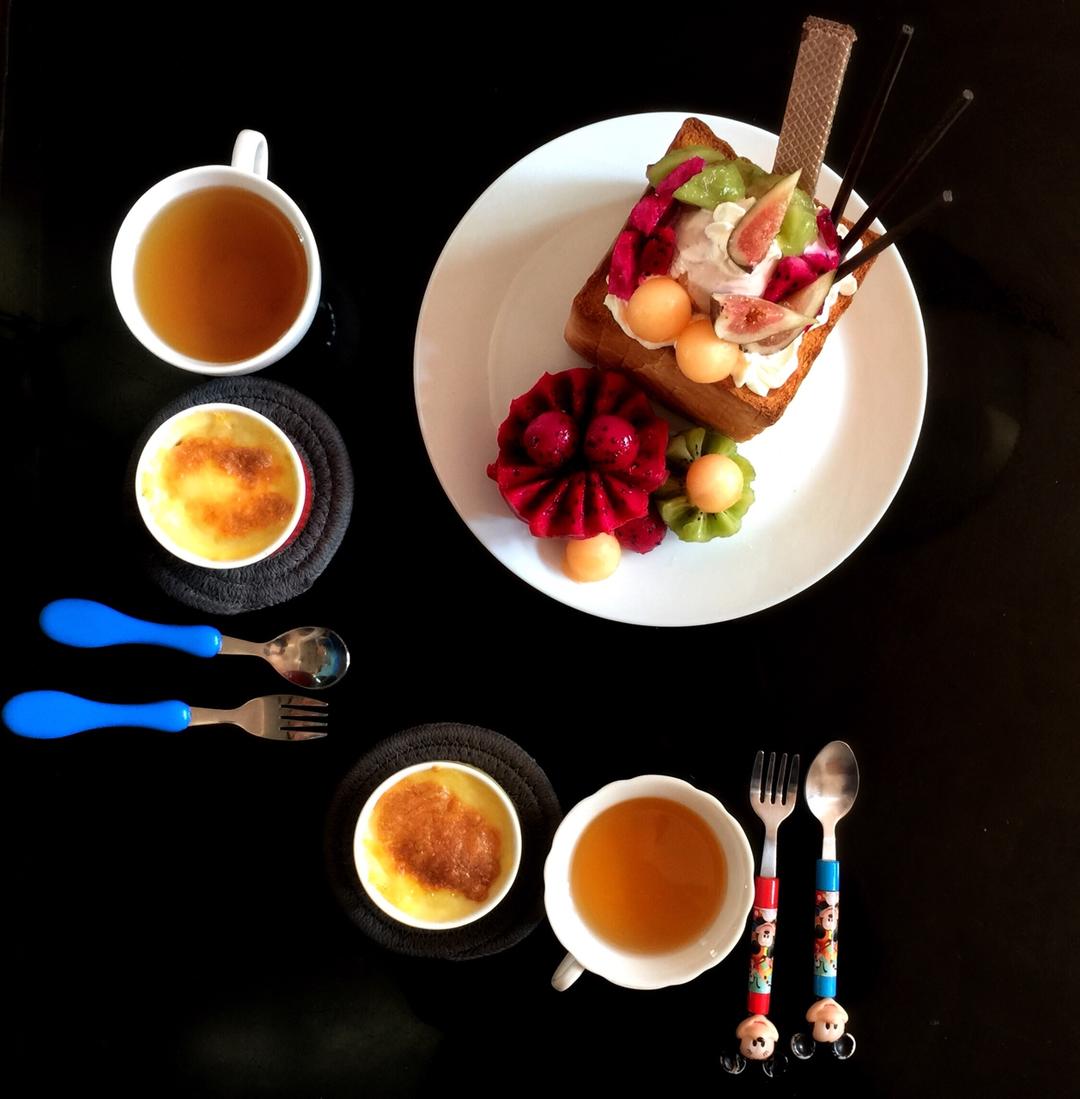 今日食,冰淇淋水果蜂蜜厚多士,火腿芝士焗薯泥,茉莉花茶