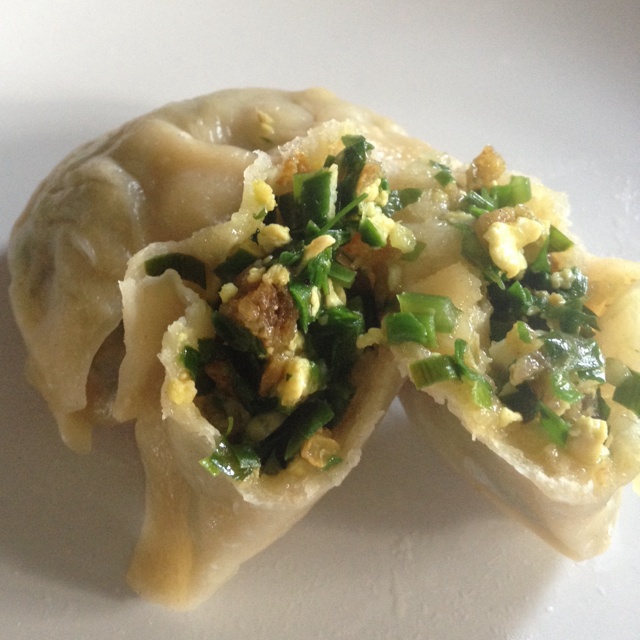 韭菜虾皮鸭蛋蒸饺。用了些朋友摘的野生韭菜和我自己种的韭菜。好好吃。