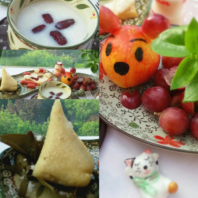 粽子^棒子面粥^草莓果酱土司^水果是桃子和提子