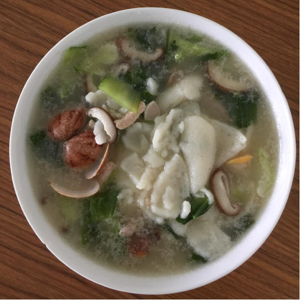 锅边,用大米加清水磨成浓浆,摊在锅边,半熟后铲入正在熬煎的虾汤...
