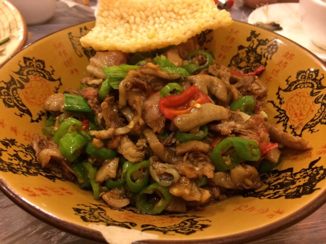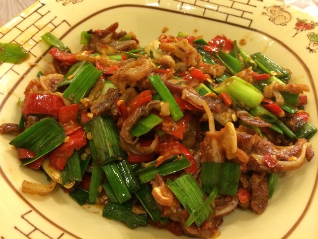 外食。青椒肥肠拆骨肉。