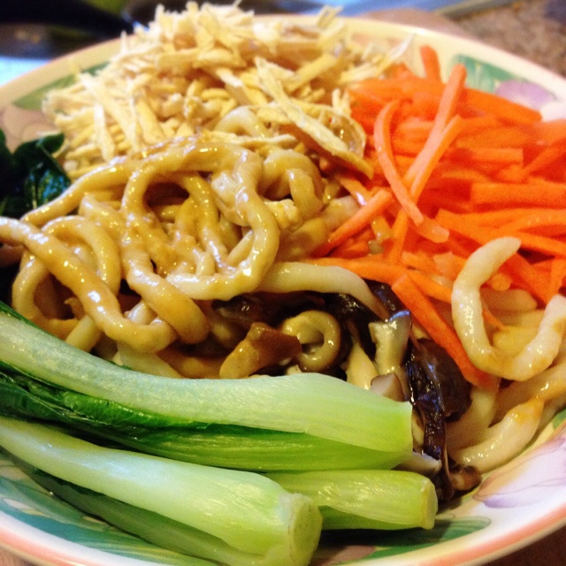 没有榨菜,烫了香菇切丝,放了点麻油和红油,大蒜也用油炸熟了,吃的我好感动,太好吃了