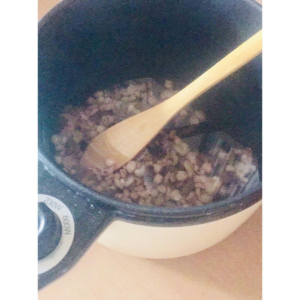 红豆和薏米入炒锅,炒制薏米微黄、红豆颜色变深,目的是去除薏米的寒气。