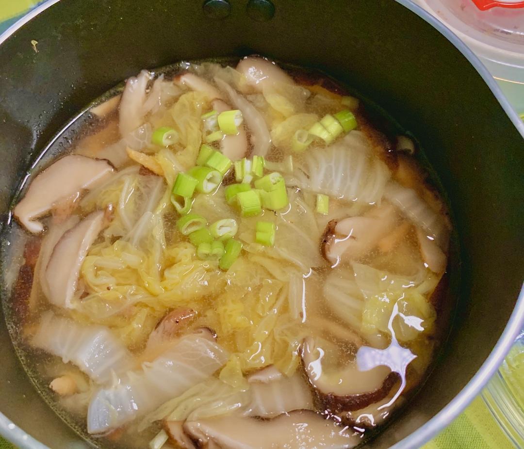 白菜切丝,煮出茶色的菌汤,撒上白胡椒和葱末,又是味蕾一次美妙的旅行✈️