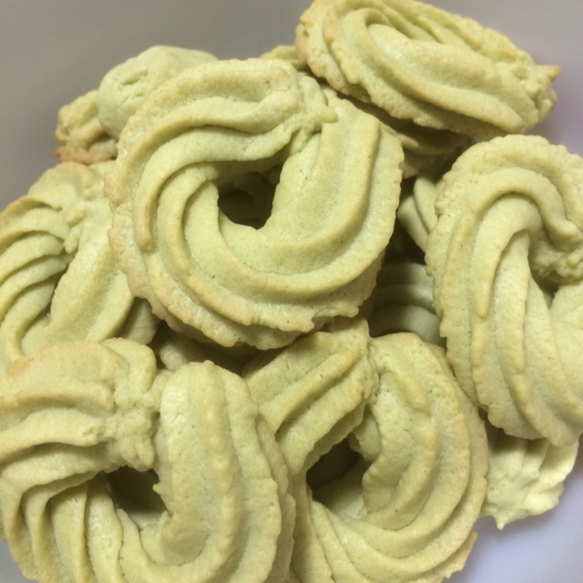 加了少量的抹茶粉,直接挤破一个一次性的袋子,果然偷懒不好,还是要用布袋挤。香,也很酥。