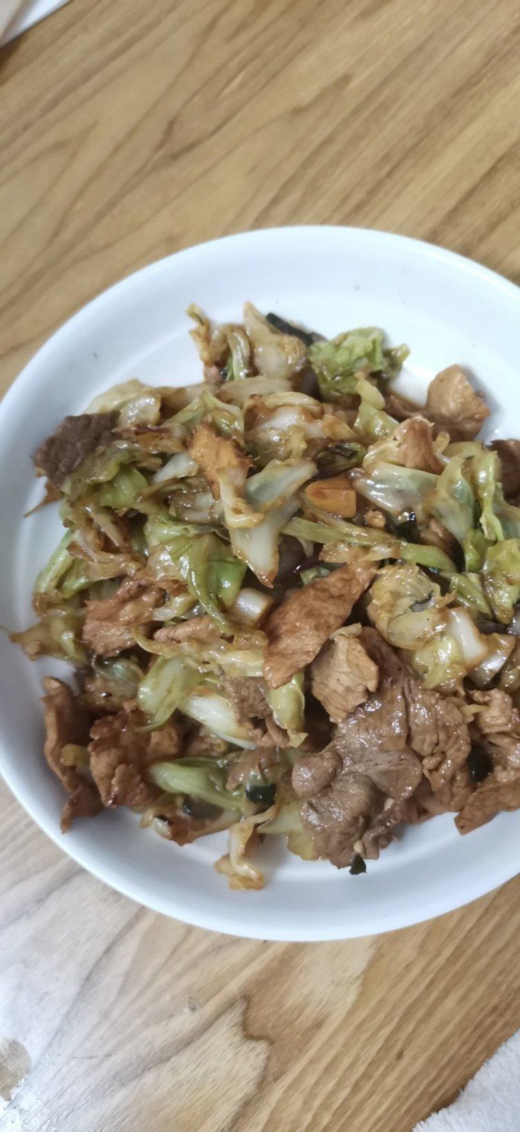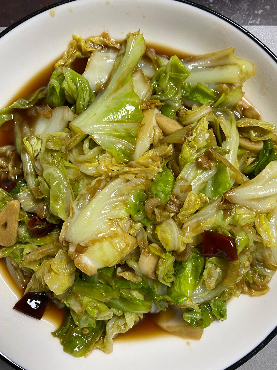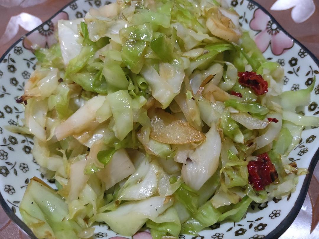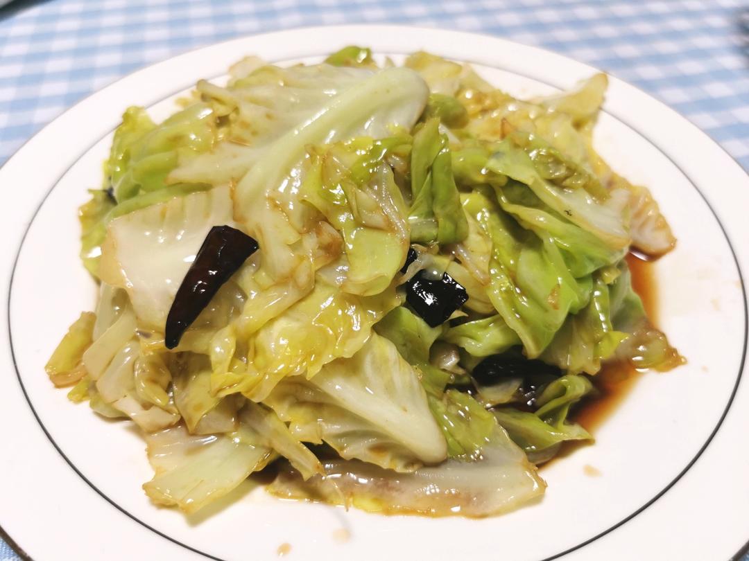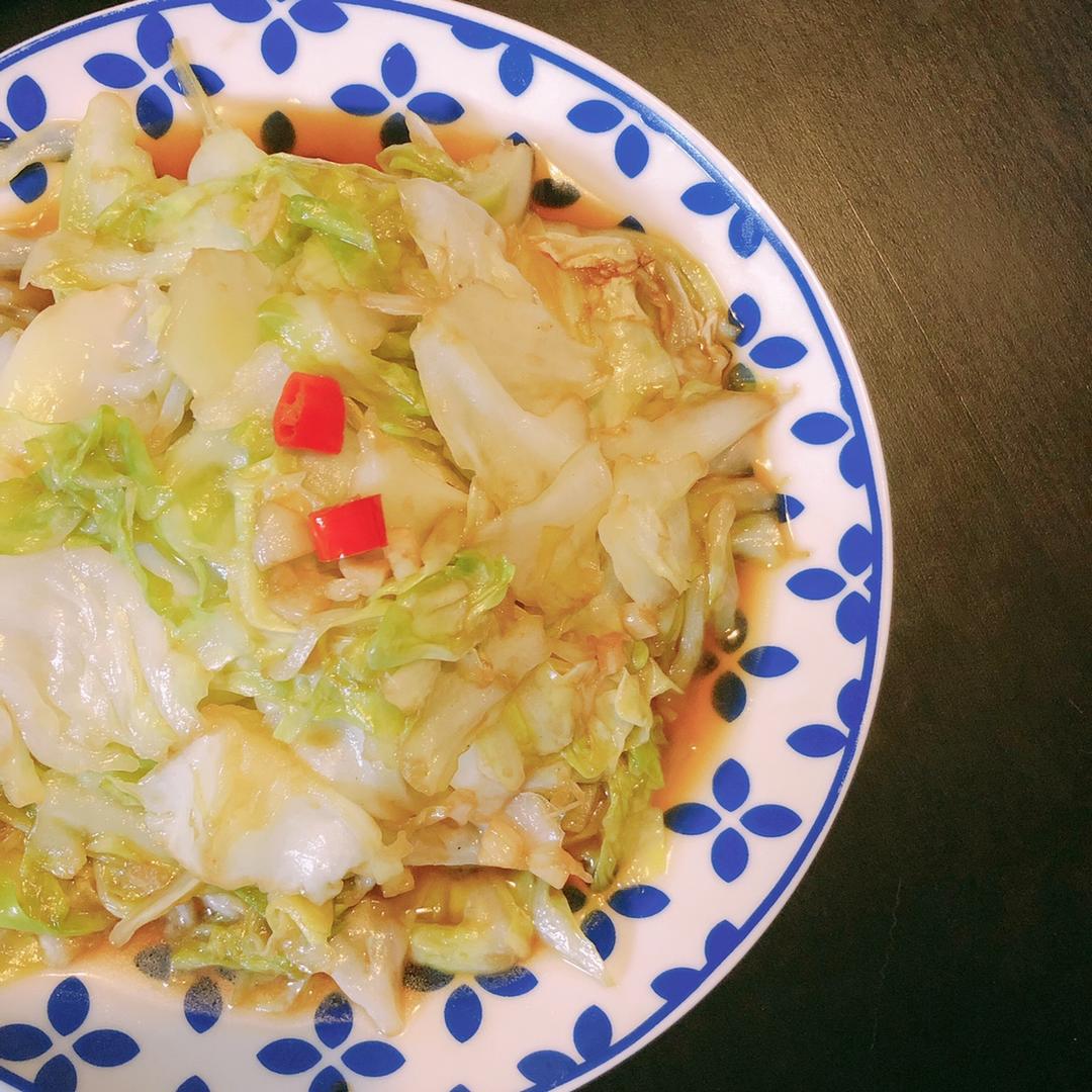 葱蒜干辣椒→包菜大火10秒 →醋盐糖 →炒→生抽