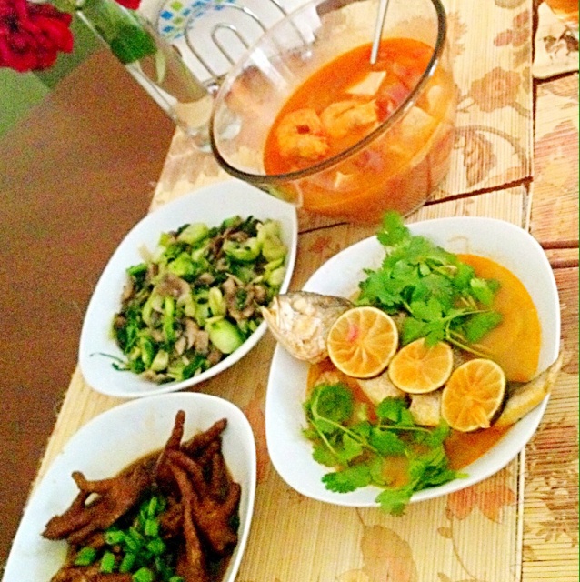 冬阴功汤,泰式煮鱼,红烧鸡爪,手捏青菜蘑菇