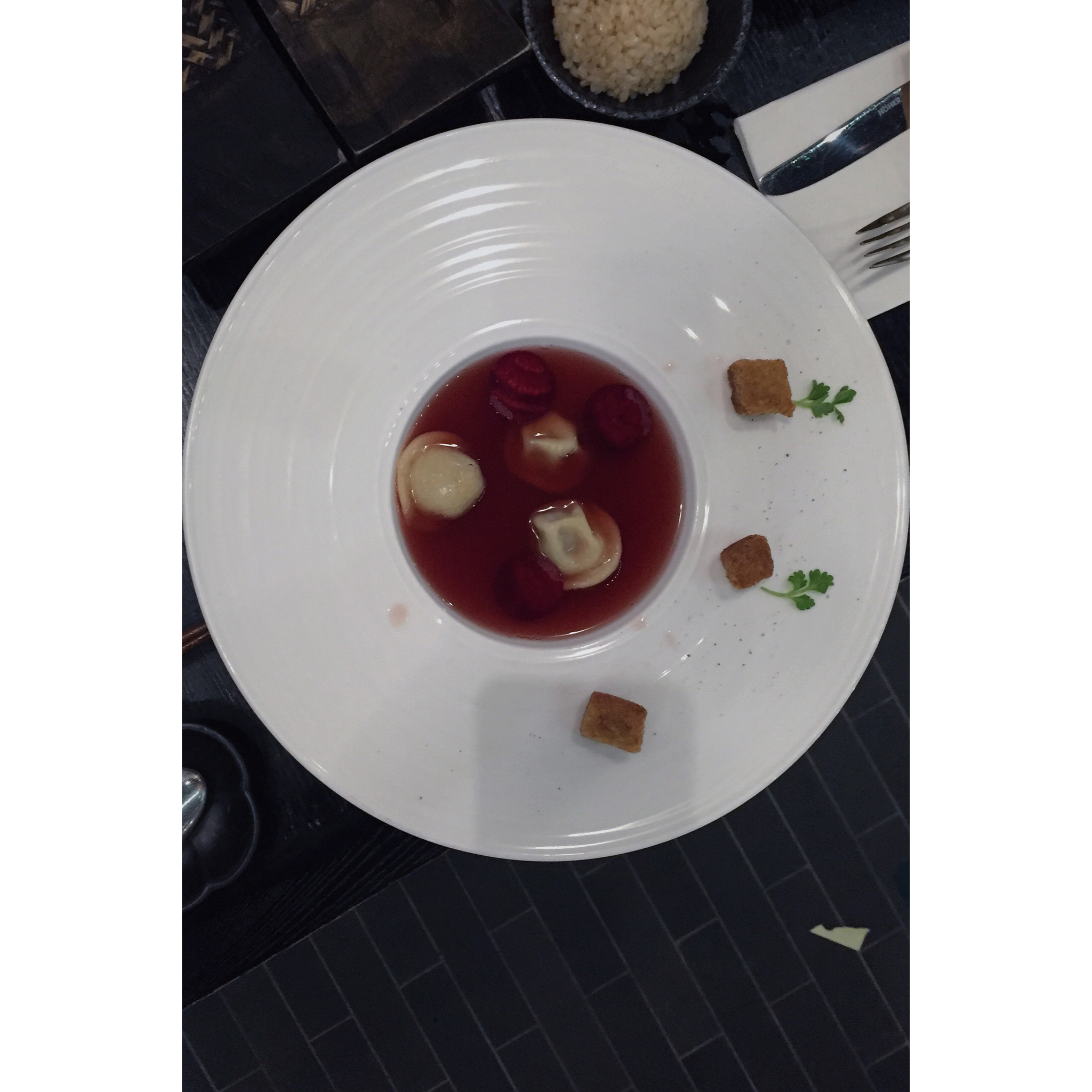 这个是牛肉甜菜汤配鹅肝牛肉饺子,有一种分子料...