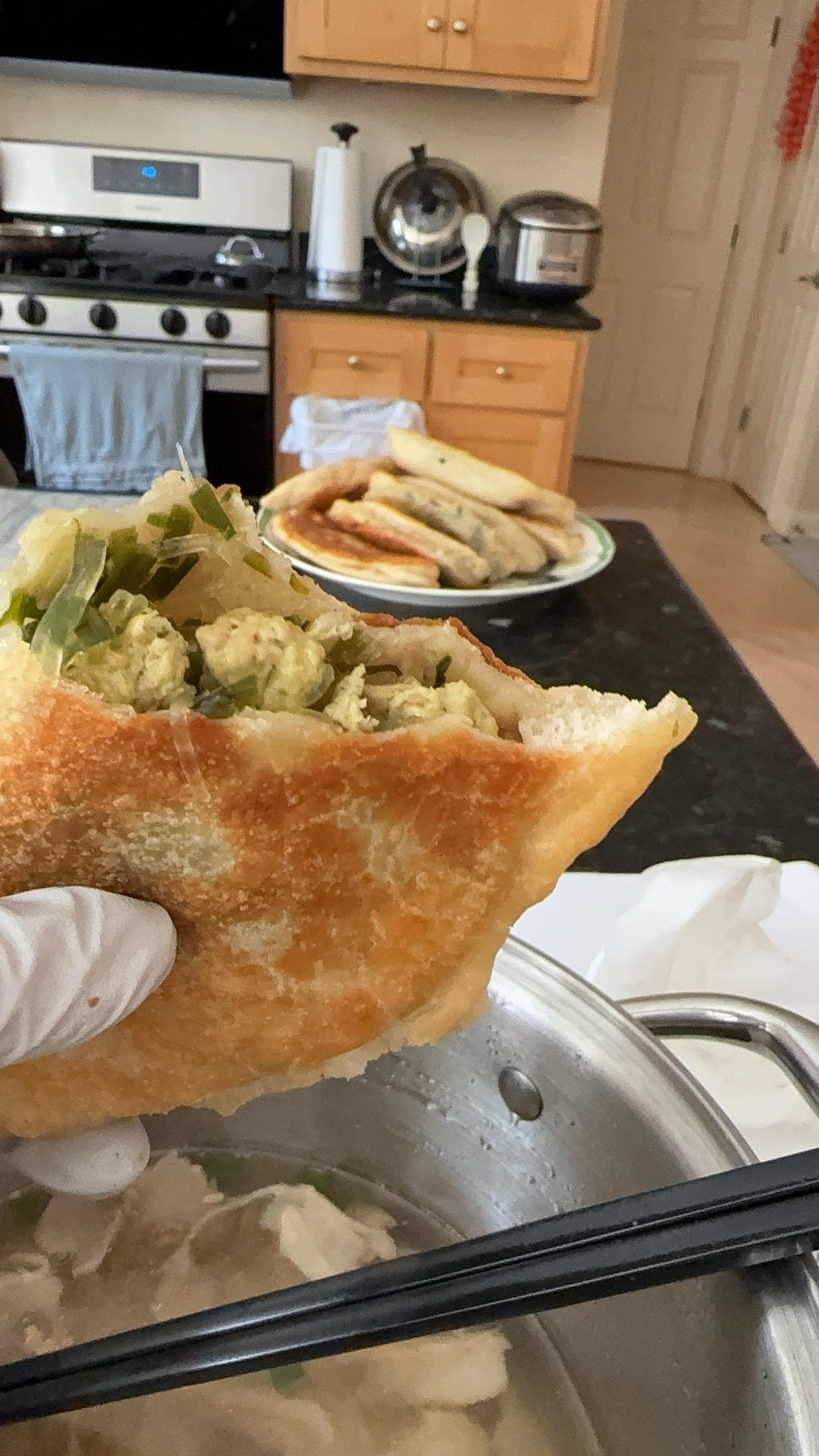 太好吃了吗的!我还加了虾仁🍤 这是我第一次做韭菜盒子,没想到这么成功 烫面的真的非常柔软,很好吃