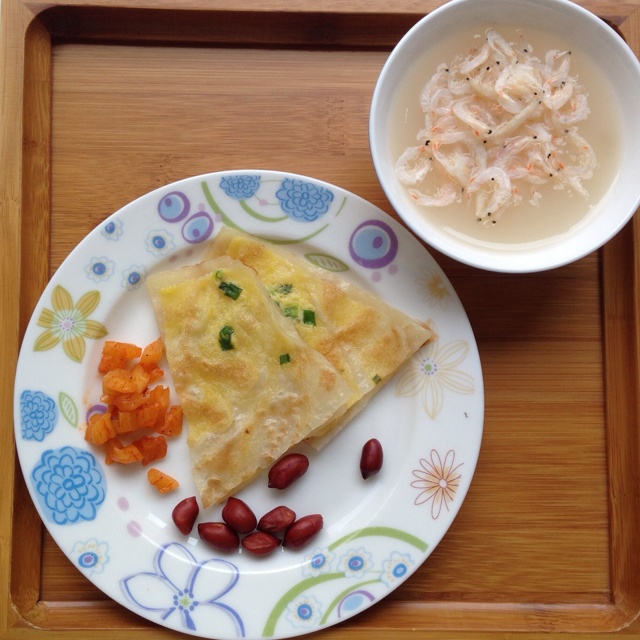 今天换中式的早餐(^ω^):鸡蛋薄饼配小米粥