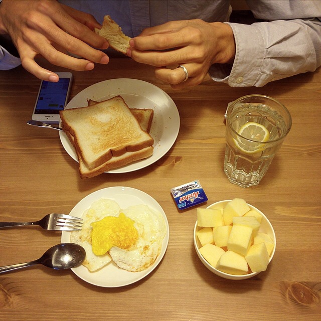 鸽大王最爱吃的早餐是港式/美式,多士炉叮过的脆吐司抹上有盐黄油,港式晨餐的煎蛋…… 吐司,只能用多士炉叮,其他做法他一概不吃T_T 说是什么最简单朴实的华丽美味。