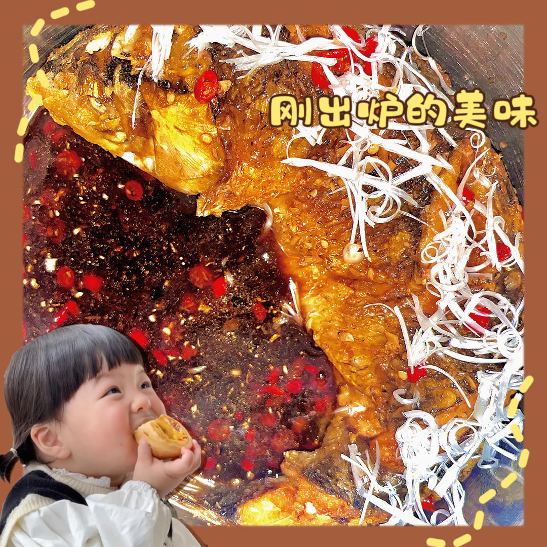 鲤鱼1kg、清洗干净切花刀,厨房纸吸干水分,撒上少许生粉下锅炸至两面金黄,放入葱姜蒜片,倒入料酒、生抽、老抽...