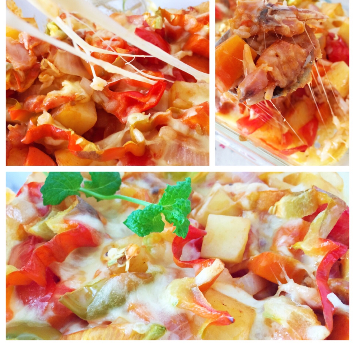 第一次做焗饭,完全没有经验,饭少,料多了,无奈分成两碗。马苏里拉像不要钱似的,撒了那么多,都融化掉了。